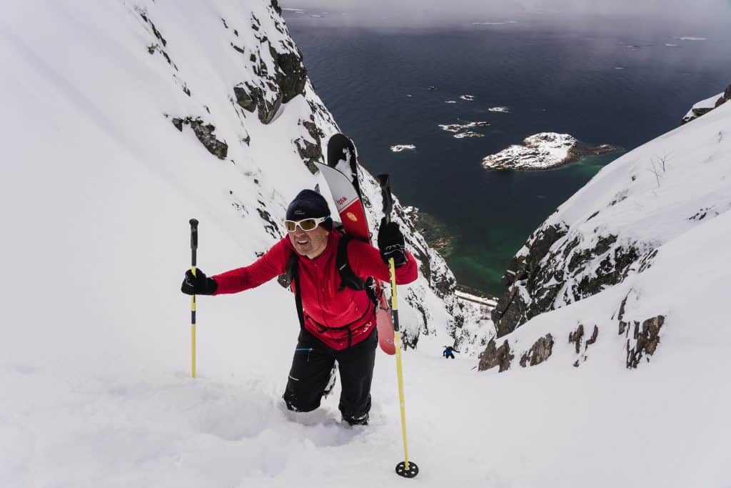 Les Lofoten se composent d’un large dédale d’îles péniblement reliées entre elles par la route et une multitude de ponts, ainsi qu’autant de montagnes abruptes et de faces potentiellement skiables dépassant rarement les 1000 mètres. Un spot idyllique où les effets néfastes de l’altitude sont réduits à néant, mais qui est régit par une double loi : la montagne n’est pas la seule à imposer ses règles, la mer n’est jamais très loin et certains massifs ne sont accessibles que par les eaux. Une contrainte qui explique à elle seule pourquoi tant de belles lignes restent à ouvrir.